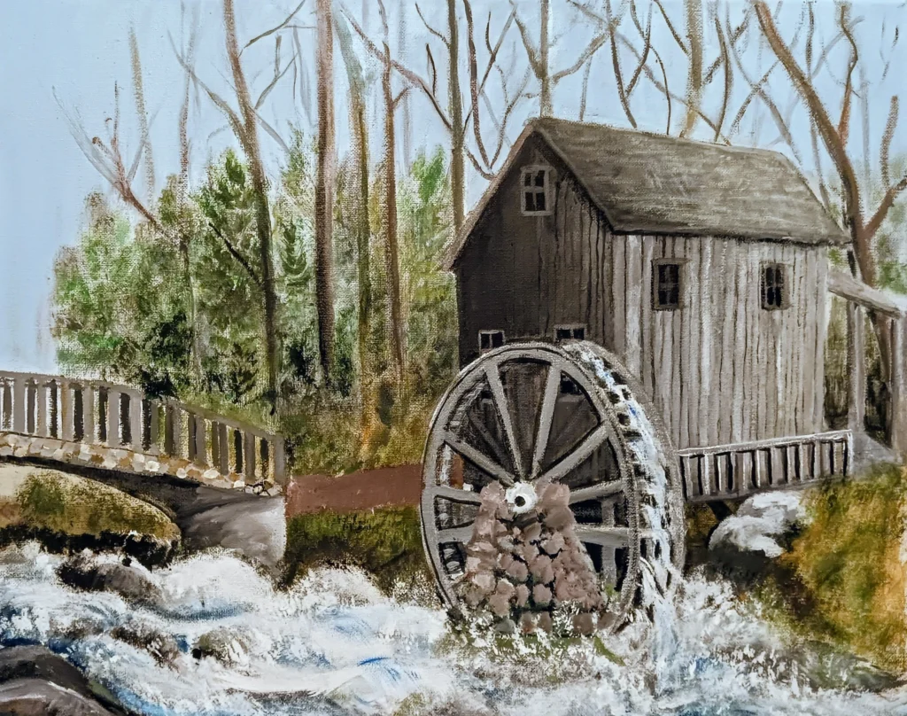 A rustic watermill stands quietly in a forest clearing, its wooden water wheel turning gently in a flowing stream. Wheels of Time captures the charm and functionality of traditional rural architecture, blending natural textures with historical warmth. Time is ageless.
