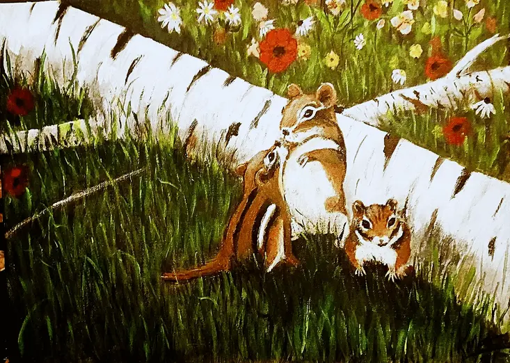 Chjpmunk art featuring a family of chipmunks enjoying spending time together in a flower covered field