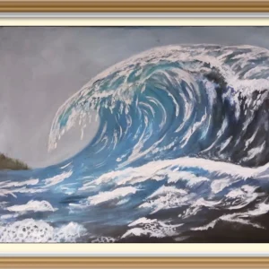This vivid seascape captures the cresting motion of a wave in blues, whites, and blacks, with expressive foam and spray that convey the ocean’s power. Stormy skies deepen the mood, adding contrast and atmosphere. Perfect for seascape collectors ,and it will brighten any space